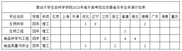 烟台大学生命科学学院2023年省外高考综合改革省份专业来源计划表