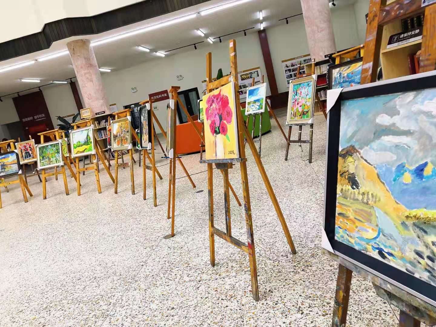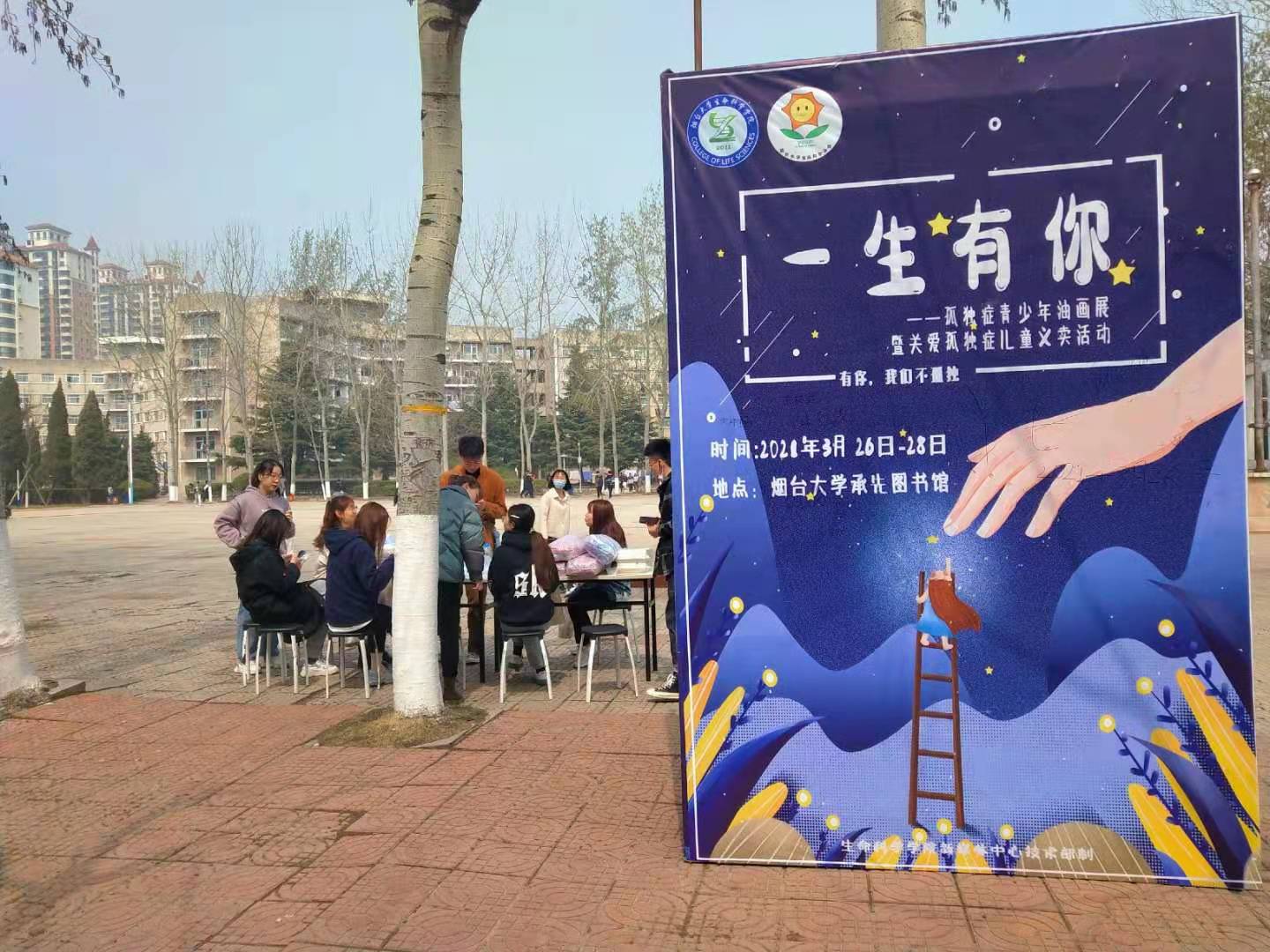 在承先图书馆内,数十幅风格各异的油画错落排布,从苍山翠柏到富士山景,从抽象星空到静物描摹,每一幅都由自闭症孩子绘制而成,在他们独特的世界里,艺术也许正是那探析世界的窗口。“正常的话她应该已经在读大学了,我们会这样一直画下去,画到哪天算哪天,每一天都很美好”,“丫毛妈妈”作为画作者家长代表看着与孩子同龄的志愿者们,微笑着说。为期三天的义卖活动,在图书馆外和青春广场同步进行,热心的“梦田花房”志愿者们,通过线上、线下多种方式帮卖自闭症家庭的手工制品,最终顺利将制品全部卖出,所得善款全部属于关爱自闭症儿童组织。