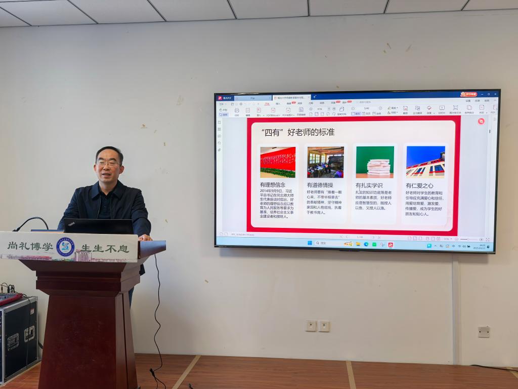 会上,王者旭带领全体教职工集中学习了《烟台大学师德教育警示录》,深入解读习近平总书记关于师德师风重要论述。他表示,学院要进一步加强教师队伍建设,严守教师职业道德(行为)规范,深入剖析了在作风建设和师德师风方面可能存在的潜在风险与突出问题,强调全体教职工要进一步提高政治站位,坚持以案为鉴,警钟长鸣,坚守师德底线,不碰纪律红线;要大力弘扬教育家精神,以优良的作风和崇高的师德引领学生健康成长。