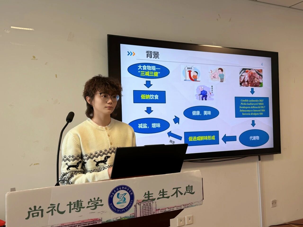 李涵分享了《酵母菌代谢调控减盐发酵香肠咸鲜味感知的机制研究》,她围绕酵母代谢物驱动的增咸效应与受体相互作用,以及汉逊德巴利酵母菌鲜味肽的呈味特征与机制展开介绍,通过电子舌、LC-MS/MS、GC-MS对香肠咸度进行量化,并通过四条技术路线形象的呈现了实验路径, 为“减盐不减咸”的食盐替代物研究做出了贡献。