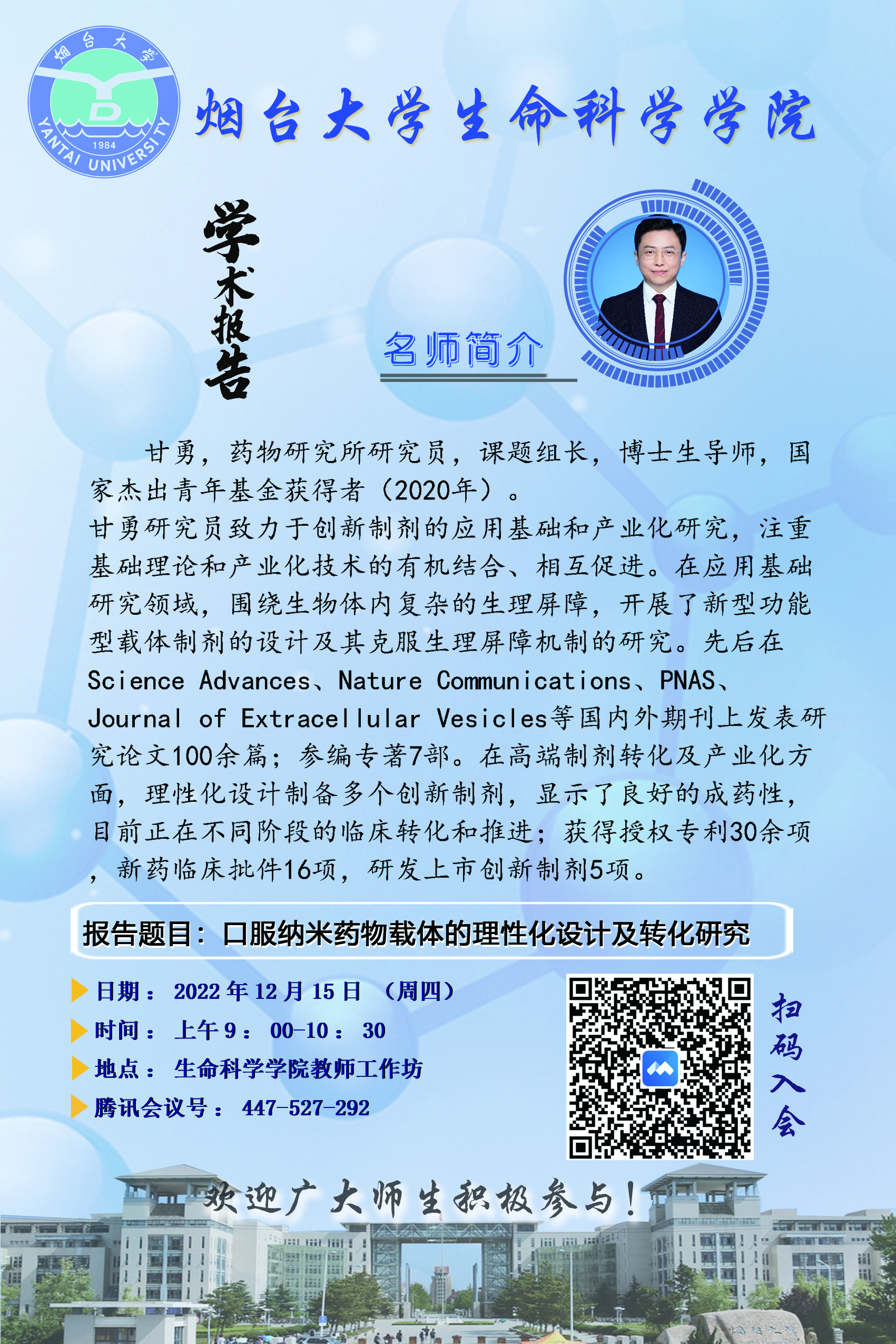 主讲人介绍:药物研究所研究员,课题组长,博士生导师,国家杰出青年基金获得者(2020年)。甘勇研究员致力于创新制剂的应用基础和产业化研究,注重基础理论和产业化技术的有机结合、相互促进。在应用基础研究领域,围绕生物体内复杂的生理屏障,开展了新型功能型载体制剂的设计及其克服生理屏障机制的研究。先后在 Science Advances、Nature Communications、PNAS、Journal of Extracellular Vesicles等国内外期刊上发表研究论文100余篇:参编专著7部。在高端制剂转化及产业化方面,理性化设计制备多个创新制剂,显示了良好的成药性,。目前正在不同阶段的临床转化和推进;获得授权专利30余项,新药临床批件16项,研发上市创新制剂5项。