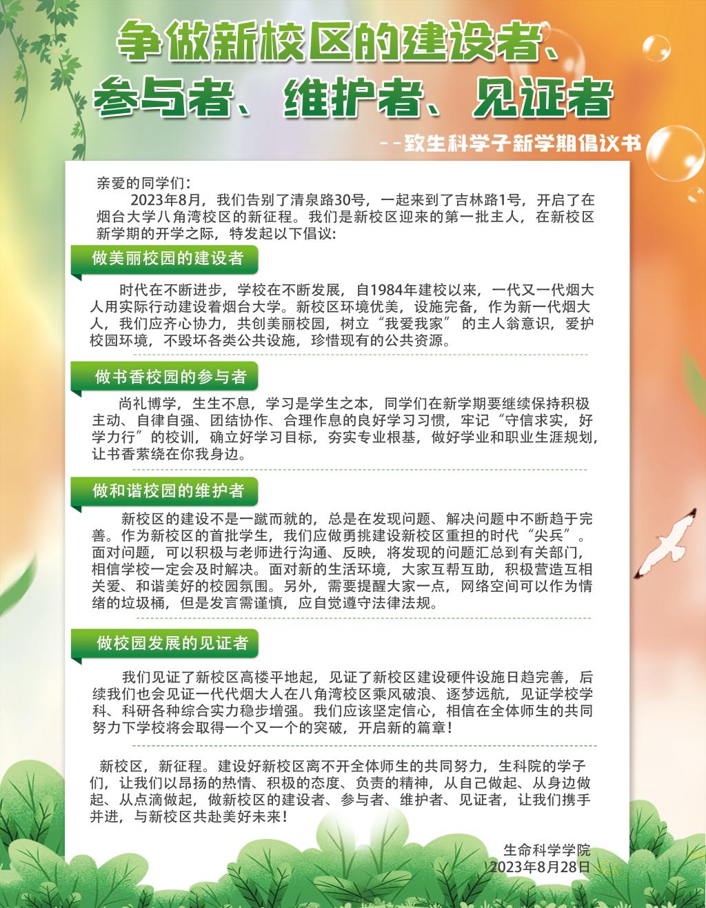 2023年8月,我们告别了清泉路30号,一起来到了吉林路1号,开启了在烟台大学八角湾校区的新征程。我们是新校区迎来的第一批主人,在新校区新学期的开学之际,特发起以下倡议: