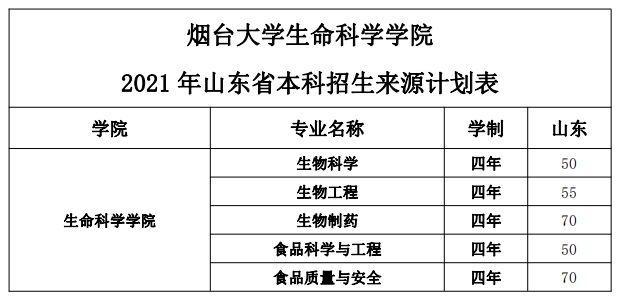 烟台大学生命科学学院2021年山东省分专业来源计划表