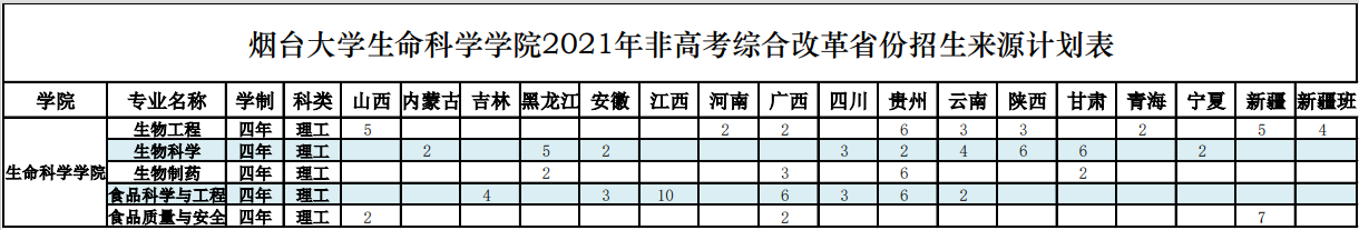 烟台大学生命科学学院 2021年非高考改革省份专业来源计划表