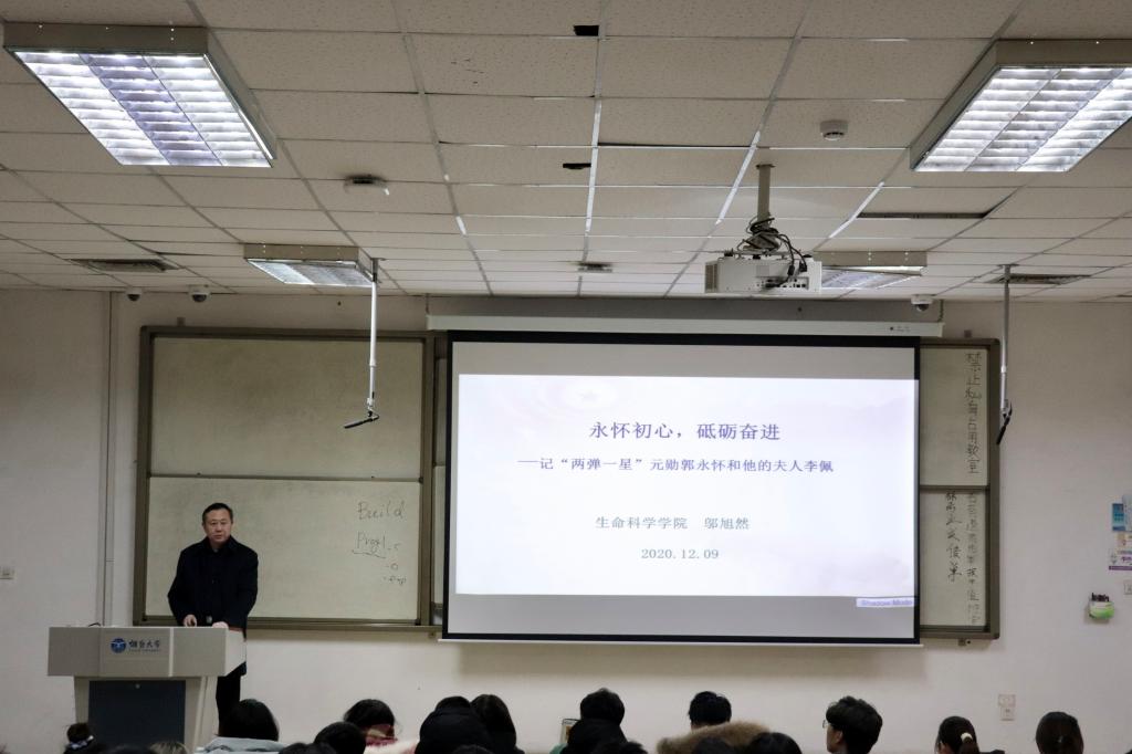 为进一步贯彻高校立德树人的根本任务,深入学习落实习近平总书记关于党史、新中国史、改革开放史、社会主义发展史学习的重要讲话和精神,努力提升思想政治理论课的针对性、时效性、创新性。12月9日晚,生命科学学院院长邬旭然在第七教学楼402为大一、大二学生骨干讲授思想政治课,主题为“永怀初心,砥砺奋进——记‘两弹一星’元勋郭永怀和他的夫人李佩”。