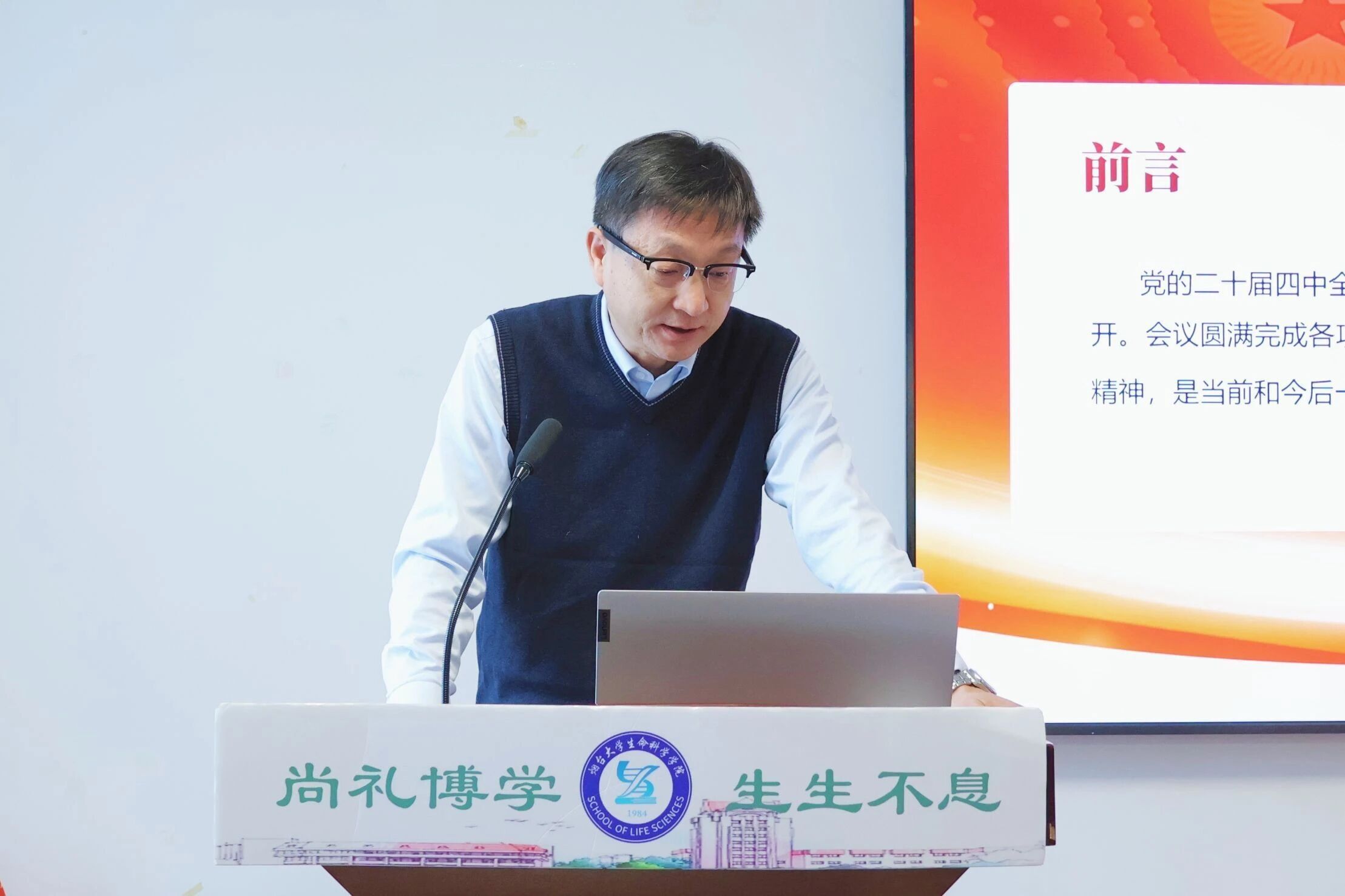 12月10日上午,烟台大学党委常委、宣传部部长杨众晖到生命科学学院作学习贯彻党的二十届四中全会精神集中学习宣讲,学院生物学教工党支部、学生党员代表、新入团团员参加,会议由学院党总支书记王者旭主持。