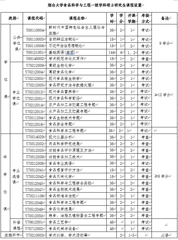 (一)课程设置见《烟台大学食品科学与工程专业硕士研究生课程设置》(附后)